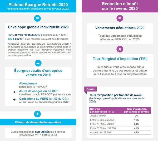 (3) Chaque épargnant peut choisir de déduire de l'assiette de ses revenus imposables à l'impôt sur le revenu tout ou partie de ses versements personnels effectués dans un PER COL, dans le respect du Plafond Épargne Retraite de son foyer fiscal (dans la limite, pour les salariés, de 10% des revenus N-1 retenus dans la limite de 8 Plafonds Annuels de la Sécurité Sociale N-1 ou de 10% du PASS N-1 si ce montant est plus élevé, et d’une enveloppe spécifique pour les Travailleurs Non Salariés). Ce plafond est calculé selon les conditions définies sur le site https://www.impots.gouv.fr/portail/particulier/epargne-retraite . À l'entrée, le traitement d'un versement personnel déductible donnera lieu à des frais précisés dans le Guide tarifaire en vigueur. À la sortie, ces sommes seront fiscalisées en fonction de la règlementation fiscale en vigueur et de la situation personnelle de chaque épargnant au moment du retrait des sommes.