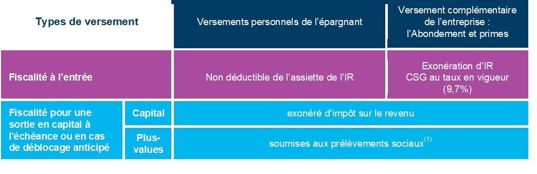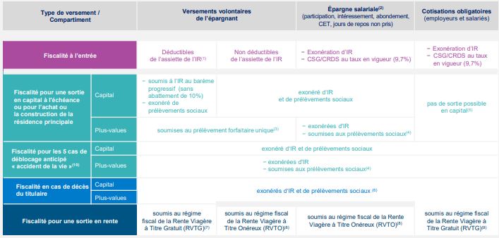 (5) Pas de sortie en capital possible sauf si le montant de la rente (à la sortie) est inférieur à 100 €/mois : Dans ce cas, la fiscalité applicable est identique à celle du compartiment « versements volontaires déductibles » (capital soumis au barème progressif de l’IR sans abattement et exonéré de prélèvements sociaux; les plus-values sont soumises au Prélèvement Forfaitaire unique de 12,8% et aux Prélèvements Sociaux à 17,2%)