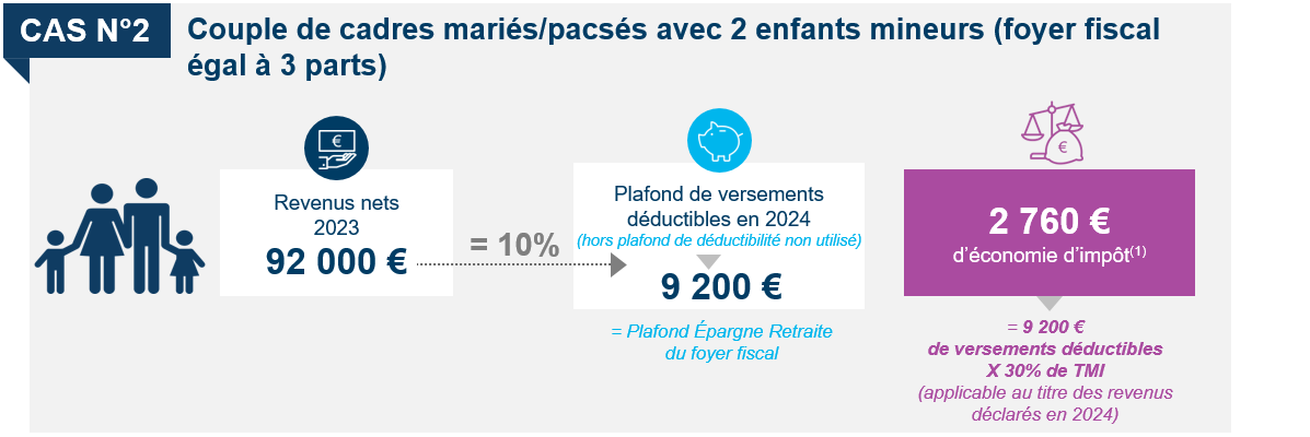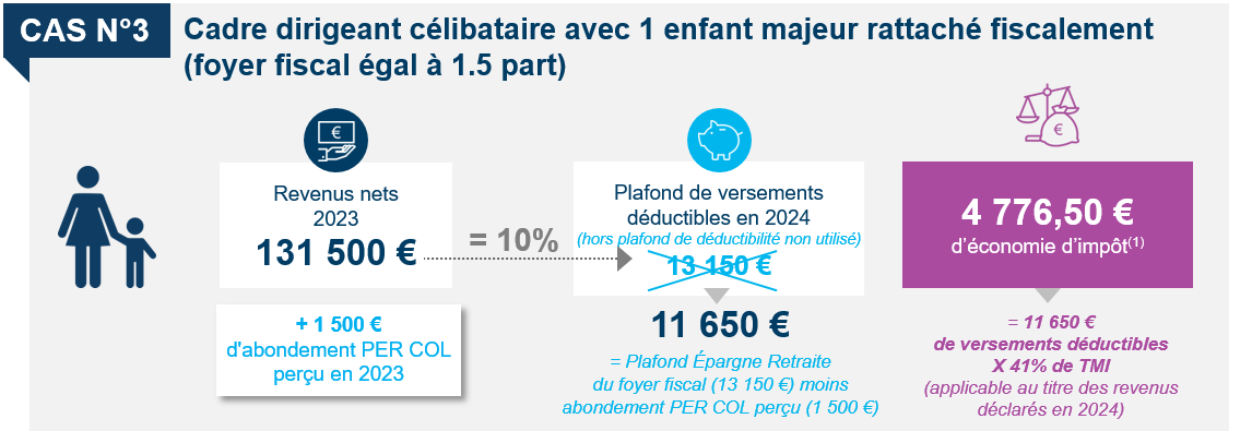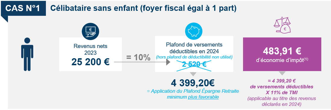(3) Chaque épargnant peut choisir de déduire de l'assiette de ses revenus imposables à l'impôt sur le revenu tout ou partie de ses versements personnels effectués dans un PER COL, dans le respect du Plafond Épargne Retraite de son foyer fiscal (dans la limite, pour les salariés, de 10% des revenus N-1 retenus dans la limite de 8 Plafonds Annuels de la Sécurité Sociale N-1 ou de 10% du PASS N-1 si ce montant est plus élevé, et d’une enveloppe spécifique pour les Travailleurs Non Salariés). Ce plafond est calculé selon les conditions définies sur le site https://www.impots.gouv.fr/portail/particulier/epargne-retraite . À l'entrée, le traitement d'un versement personnel déductible donnera lieu à des frais précisés dans le Guide tarifaire en vigueur. À la sortie, ces sommes seront fiscalisées en fonction de la règlementation fiscale en vigueur et de la situation personnelle de chaque épargnant au moment du retrait des sommes.