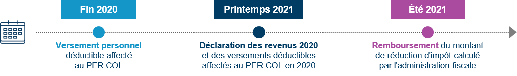 Vous avez la possibilité de déduire chaque année vos versements personnels de vos revenus imposables1 De plus, vous êtes libre de réaliser des versements personnels sur votre PER COL à tout moment et sans limite de montant.